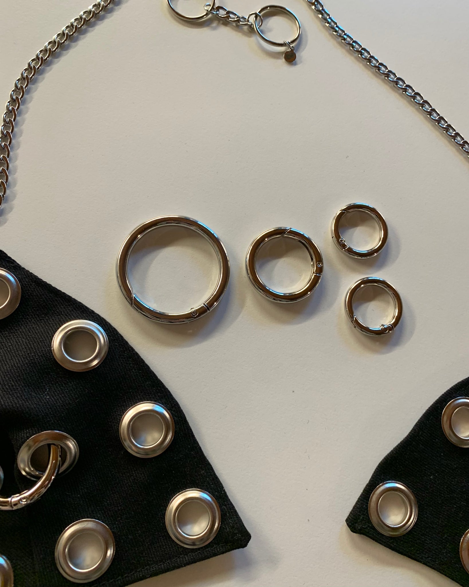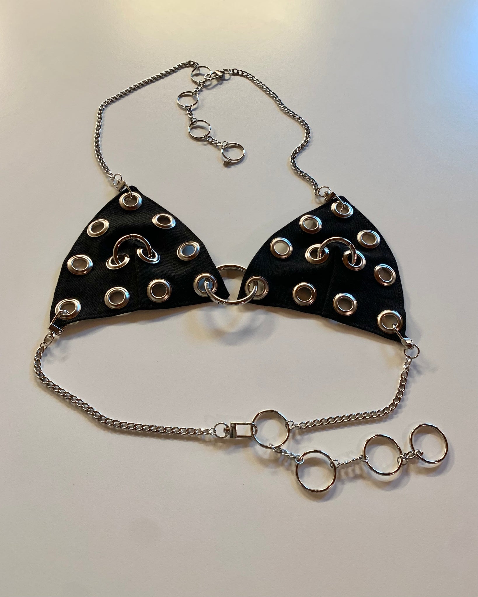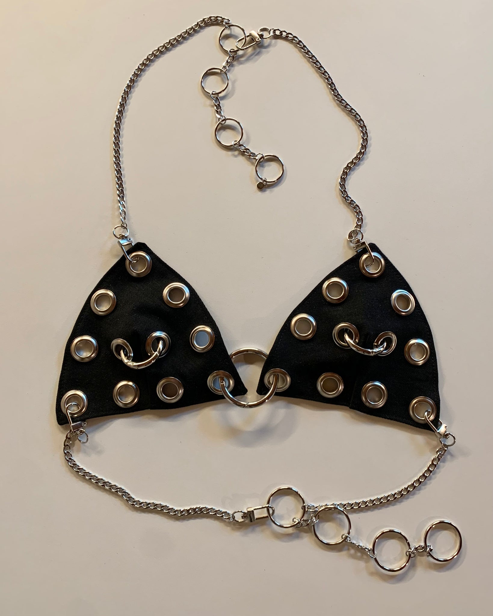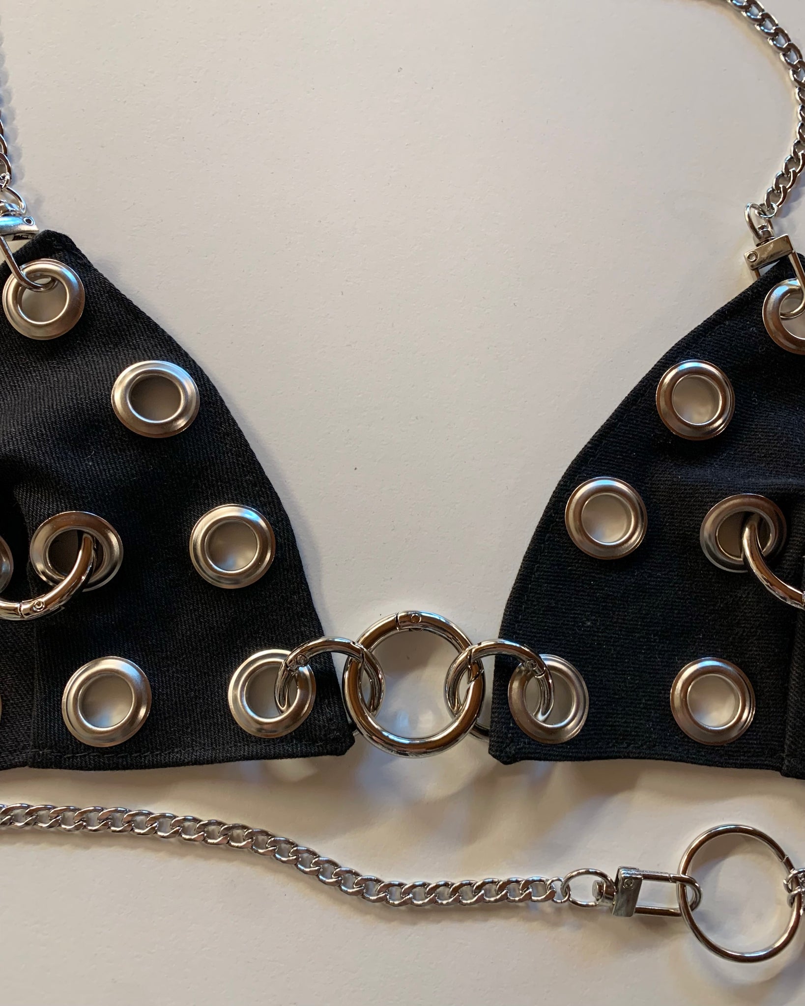 Made to order, handmade denim bra made from vintage denim scraps we’ve been saving and bright blue baby grommets and an adjustable bust and neck chain. Our denim bra from a few years ago, updated with grommets and carabiner rings. Comes with two options/sizes for rings in front. Hardware and chain are removable. Unlined and not meant to be supportive, but more of a layering piece. Designed and made in house by us, with lots love!<3